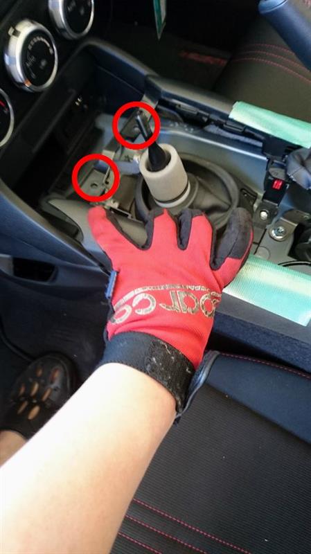 助手席側から運転席側へ配線を渡すにはセンターコンソールを浮かせるとラクそうなので、まずはシフトブーツ周りを外します。