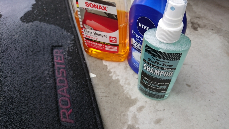 ボディーソープか頭髪用シャンプーを用いるのが我が家の慣例。しかしこれらは泡立ちが良いものの泡切れに難あり。そこで今回は二年ほど前に購入したソフトトップ用のシャンプーを試用・・・うむ、控えめな泡立ちだけど使用感はまずまず。元々は布やビニールに使うもんだしな。しかしフロアマットに使うのは少々勿体ないかな・・・。こんなに小さいのに千円ちょいの高級品だし。