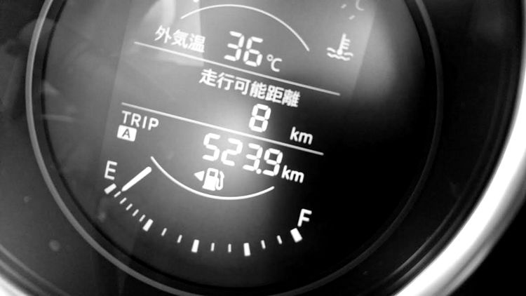 最終的には走行可能距離が僅か8kmというところでガソリンスタンドに到着。走行可能距離が表示されるクルマははじめてなもので、へー便利な機能だなぁと感心する一方、この数字をどれほどアテにして良いものかとも思います。