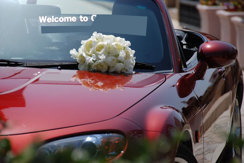 ちなみに当初のプランナーさんの案のひとつに「幌を閉じたロードスターに風船を閉じ込めておき、バルーンリリースの合図とともに幌を開けましょう」というものがあったのですが、車内は高温になる可能性があるし、狭い車内にそんなに多くの風船を収められるものではないし、それに、風船を閉じ込めた状態のNCに美しさを感じなかった・・・まるで遊園地の遊具やん・・・ので止めておきました。その他、結婚式にありがちな過度な装飾も避け、フロントスクリーンに白いブーケを配するに留めました。